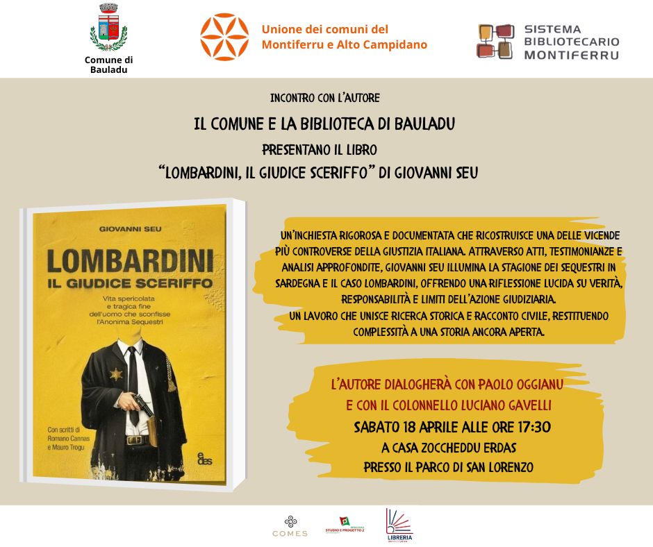 L'AUTORE DEL LIBRO GIOVANNI SEU, DIALOGHERA' CON PAOLO OGGIANU E CON IL COLONELLO LUCIANO GAVELLI SABATO 18 APRILE ALLE ORE 17.30
